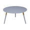 Its four angled legs are made from natural pine wood, with a warm gold tone and gentle grain that complement the table's muted white and grey hues. The rectangular table has rounded edges which soften the overall look. A central drawer provides space to store magazines and newspapers, while remote controls can be kept handy in the adjacent open shelves.