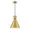 Satin brass finish metal pendant with a decorative black ring on black cable suspension.